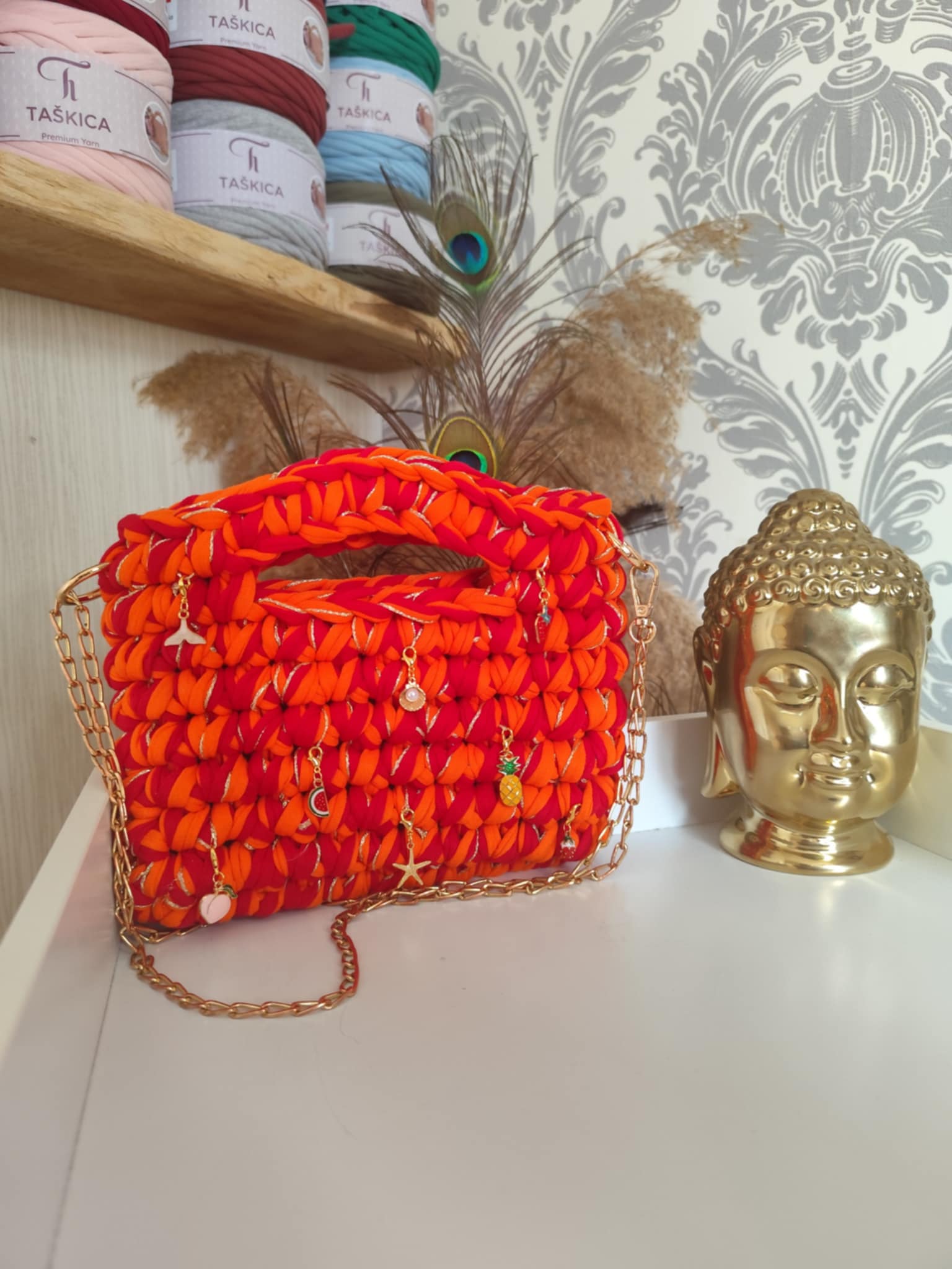 EMMA est crocheté en fil t-shirt associé à un fil brillant discret, intégré avec soin pour ajouter une touche lumineuse à l’ensemble. Ce mariage de matières offre un beau contraste entre la texture souple du fil t-shirt et l’éclat subtil du fil doré, pour un rendu à la fois moderne, élégant et unique.